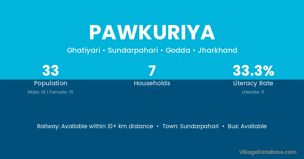 Pawkuriya village has a total population of 33 people, of which 18 are males and 15 are females.