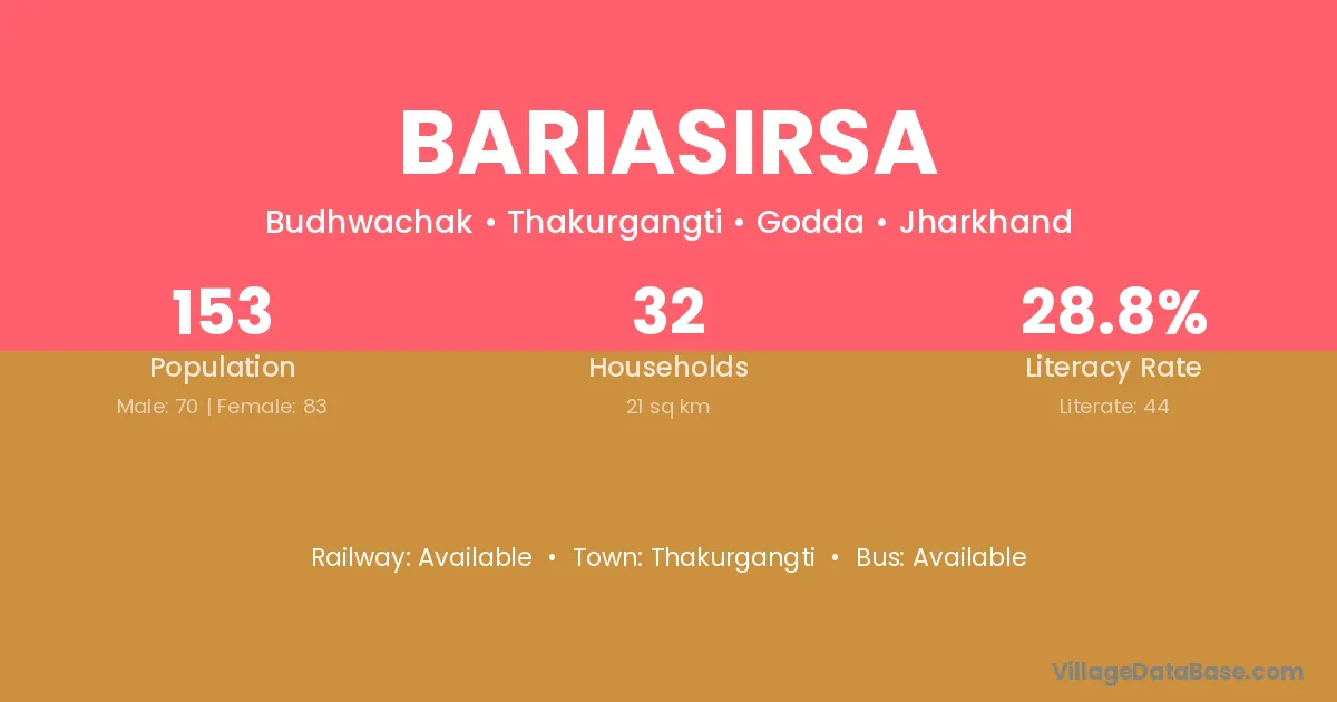Bariasirsa village has a total population of 153 people, of which 70 are males and 83 are females.