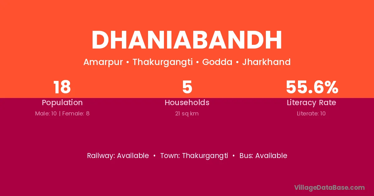 Dhaniabandh village has a total population of 18 people, of which 10 are males and 8 are females.