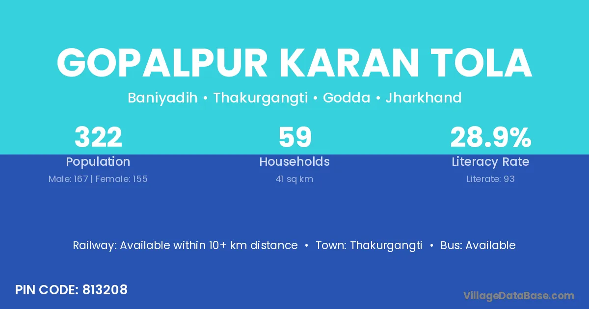 Gopalpur Karan Tola village has a total population of 322 people, of which 167 are males and 155 are females.