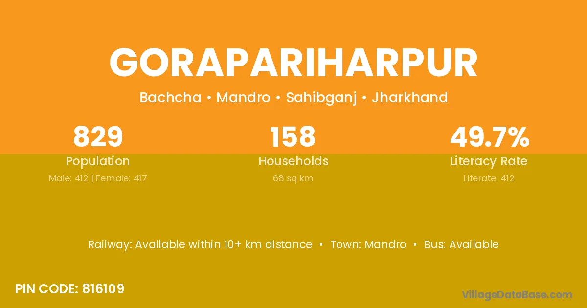 The literacy rate of Gorapariharpur village is 15.38%. Male literacy stands at 28.57% and female literacy at 0.00%.