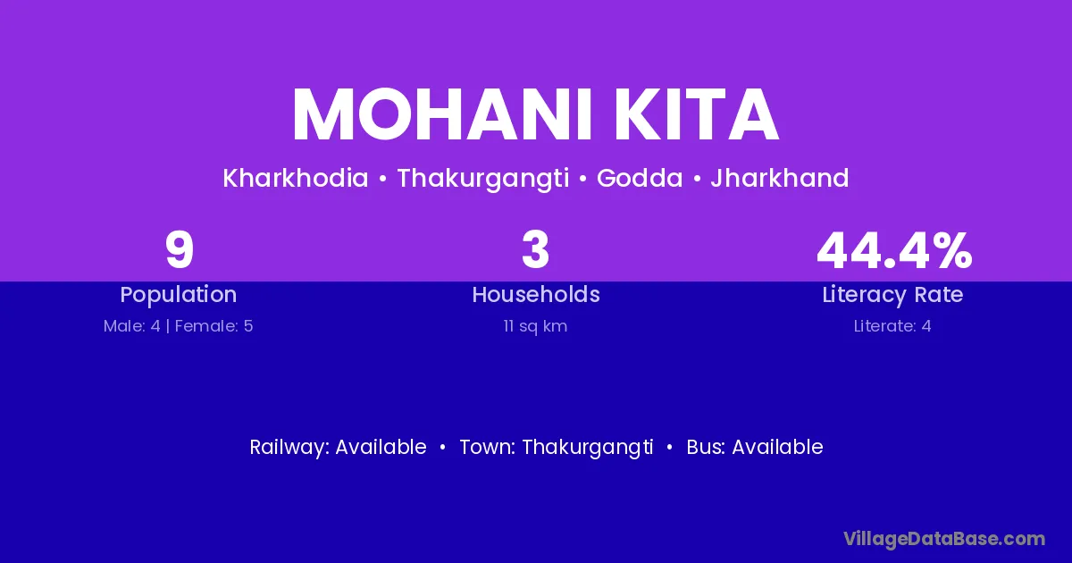 Mohani Kita village has a total population of 9 people, of which 4 are males and 5 are females.