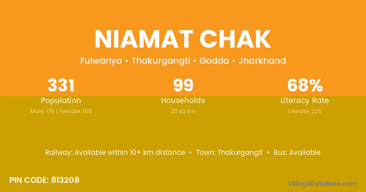 Niamat Chak village has a total population of 331 people, of which 176 are males and 155 are females.