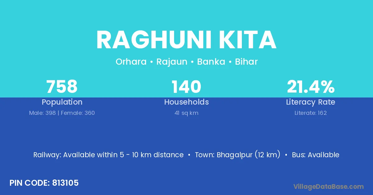 Sahibganj (38 km) is the nearest town to Raghuni Kita village for major economic activities and is located approximately 38 km away.