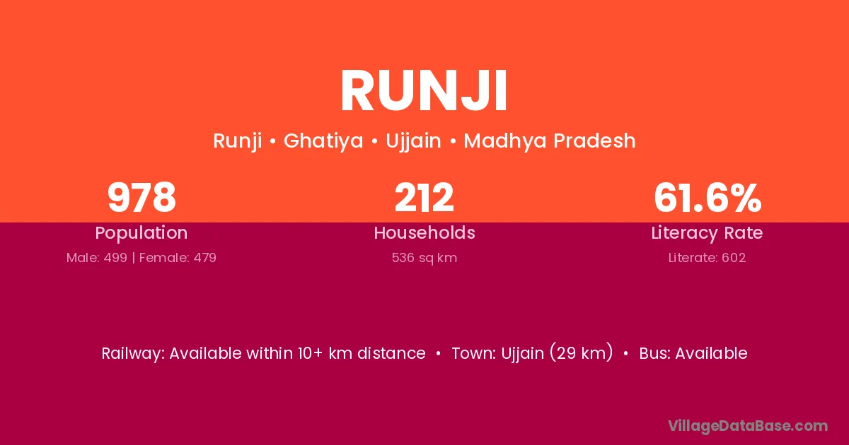 The literacy rate of Runji village is 43.54%. Male literacy stands at 52.24% and female literacy at 34.24%.