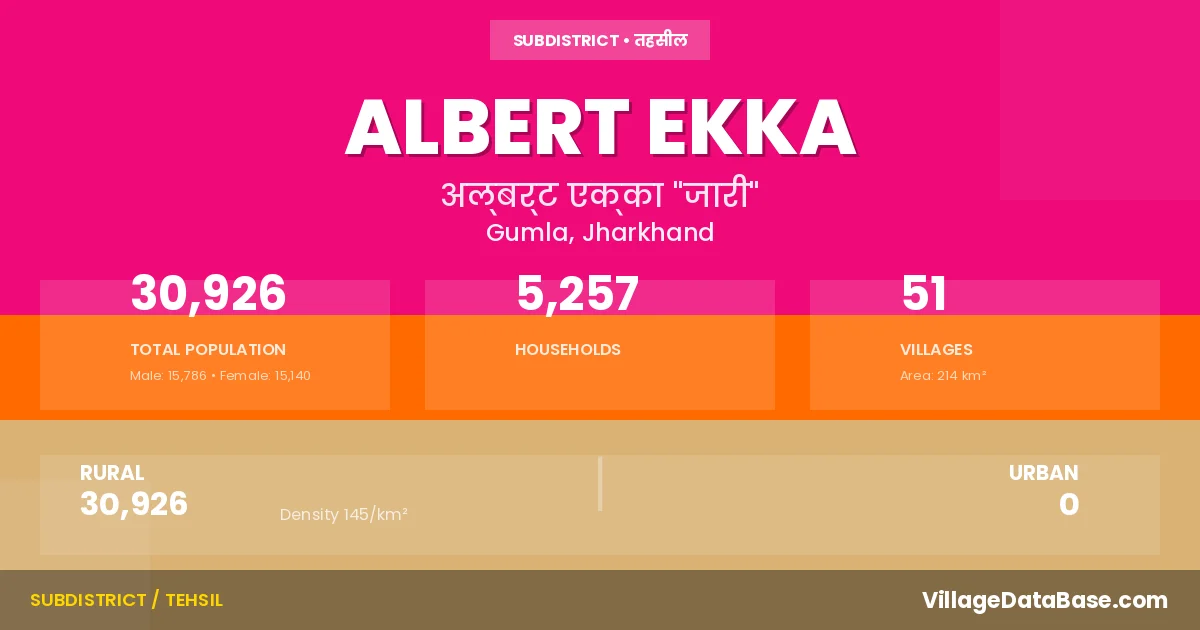 Albert Ekka is a town and Subdivision in the Gumla district of the Jharkhand. In India, a Subdivision is a subdivision of a district responsible for the administration and revenue collection of a specific area within the district. Subdivisions play a crucial role in the local governance structure, contributing significantly to the development and administration of their communities.
