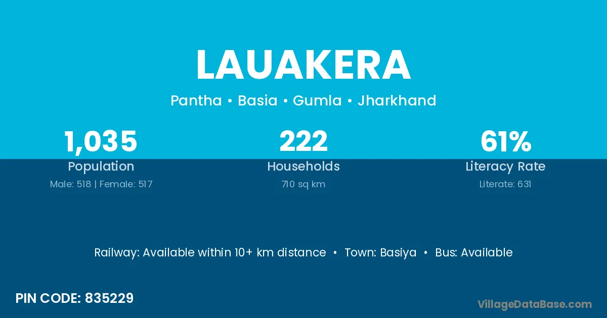 Lauakera village has a total population of 1,035 people, of which 518 are males and 517 are females.