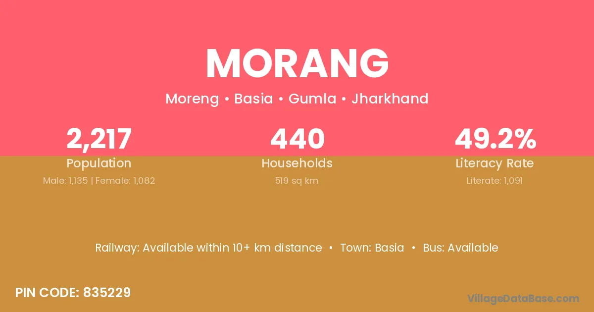 Morang village has a total population of 2,217 people, of which 1,135 are males and 1,082 are females.