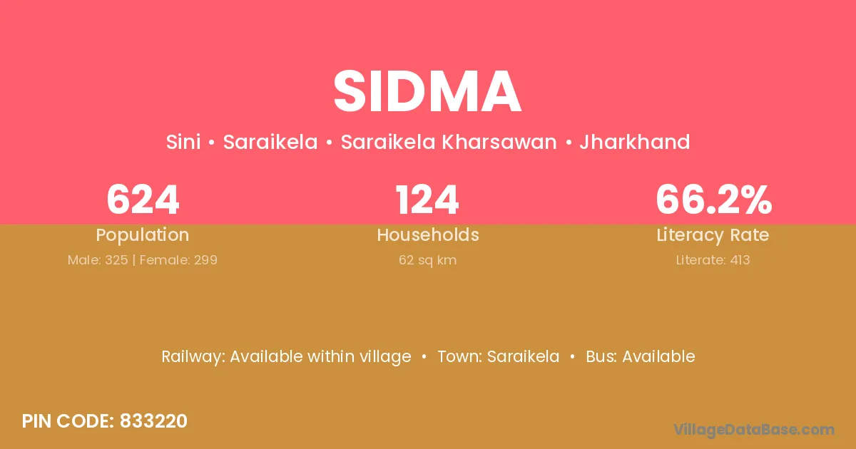 According to Census 2011 information, the village code of Sidma village is 835229.