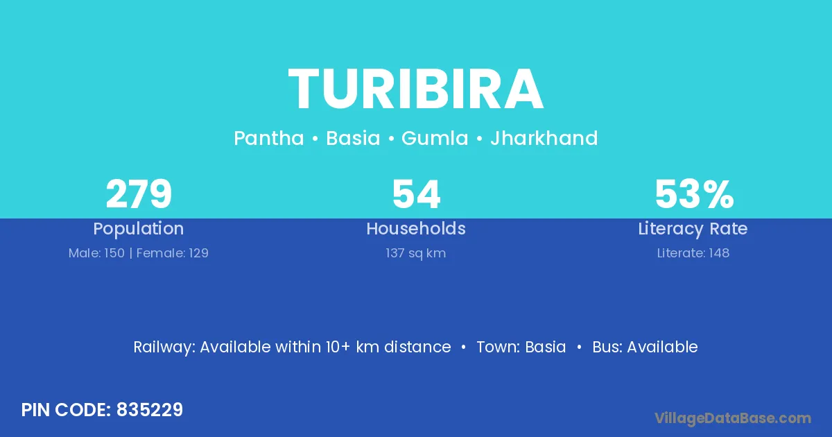 Turibira village has a total population of 279 people, of which 150 are males and 129 are females.