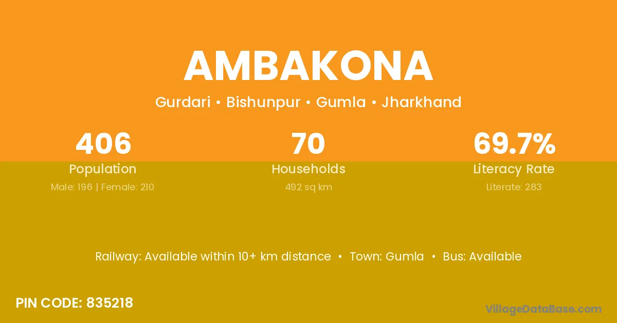 Ambakona village has a total population of 406 people, of which 196 are males and 210 are females.