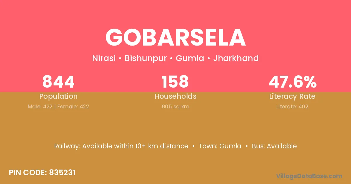Gobarsela village has a total population of 844 people, of which 422 are males and 422 are females.