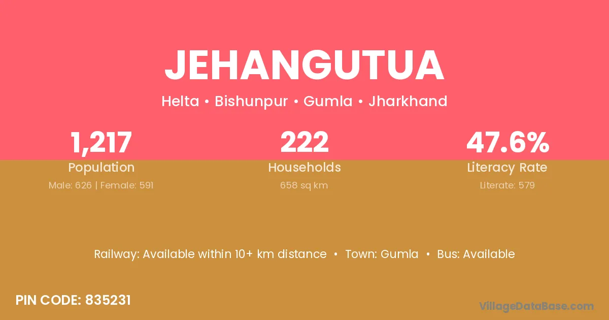 Jehangutua village has a total population of 1,217 people, of which 626 are males and 591 are females.