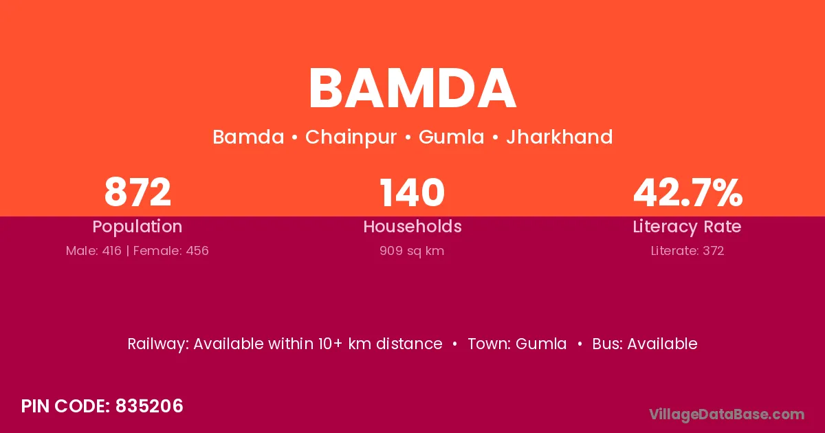 Bamda village has a total population of 872 people, of which 416 are males and 456 are females.