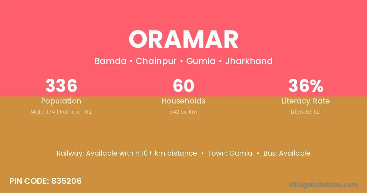 The literacy rate of Oramar village is 36.01%. Male literacy stands at 45.98% and female literacy at 25.31%.