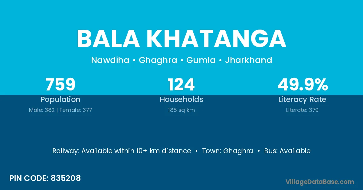 Bala Khatanga village has a total population of 759 people, of which 382 are males and 377 are females.