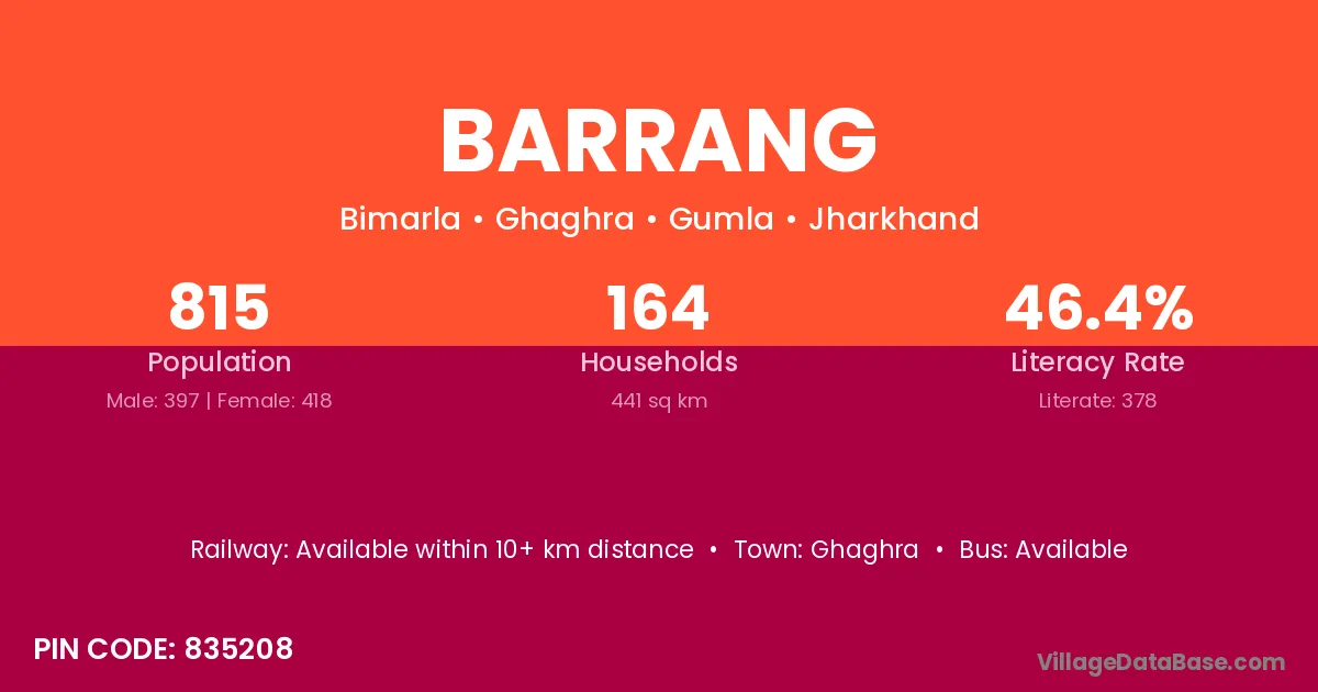 Barrang village has a total population of 815 people, of which 397 are males and 418 are females.