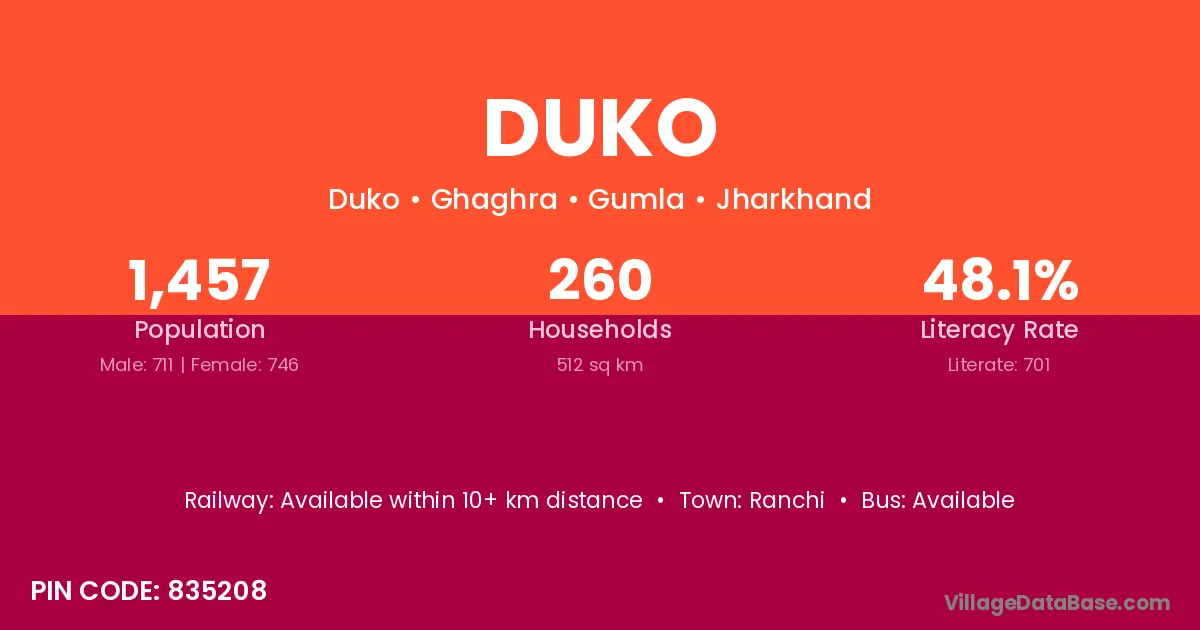 Ranchi is the nearest town to Duko village for major economic activities