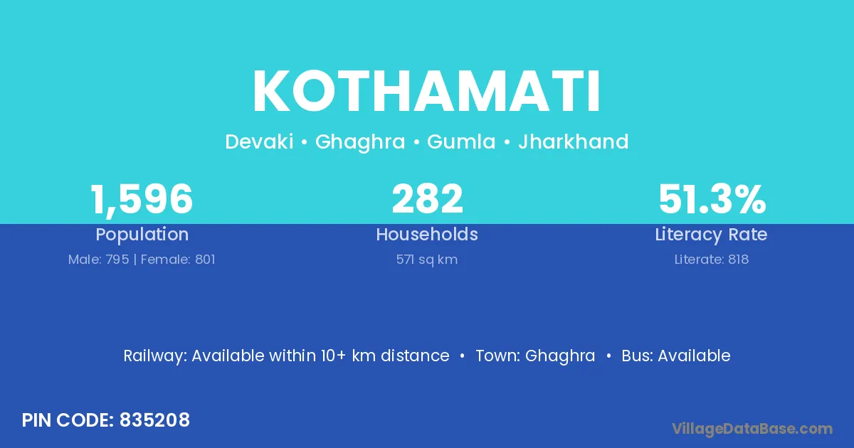 Kothamati village has a total population of 1,596 people, of which 795 are males and 801 are females.