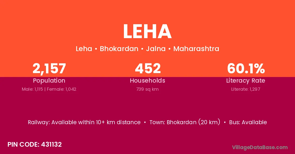 The literacy rate of Leha village is 40.81%. Male literacy stands at 48.33% and female literacy at 33.11%.
