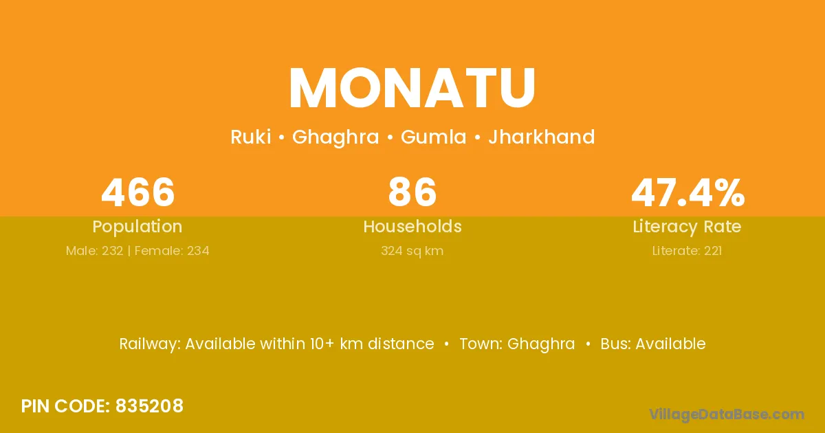 Monatu village has a total population of 466 people, of which 232 are males and 234 are females.