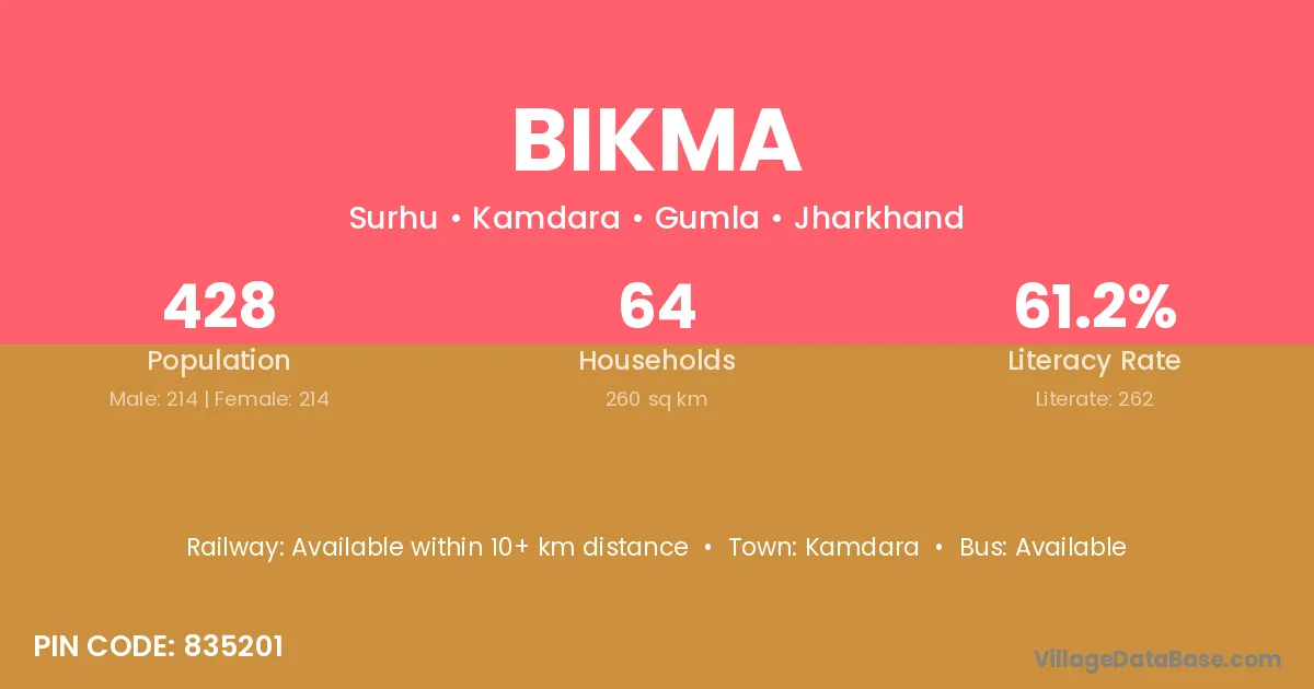 Bikma village has a total population of 428 people, of which 214 are males and 214 are females.