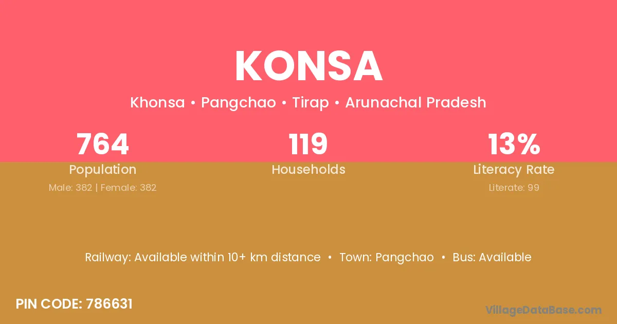 The literacy rate of Konsa village is 49.60%. Male literacy stands at 60.12% and female literacy at 39.21%.