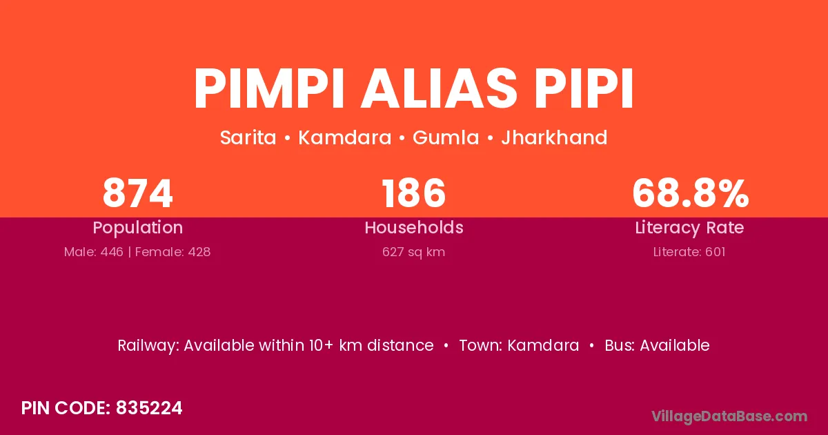 Pimpi Alias Pipi village has a total population of 874 people, of which 446 are males and 428 are females.