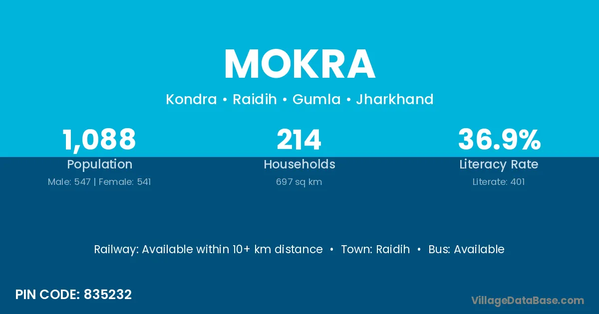 Mokra village has a total population of 1,088 people, of which 547 are males and 541 are females.