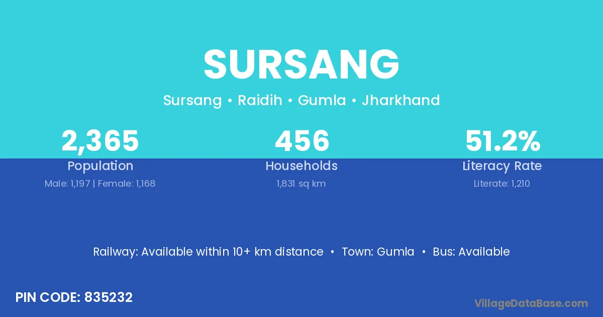 Sursang village has a total population of 2,365 people, of which 1,197 are males and 1,168 are females.