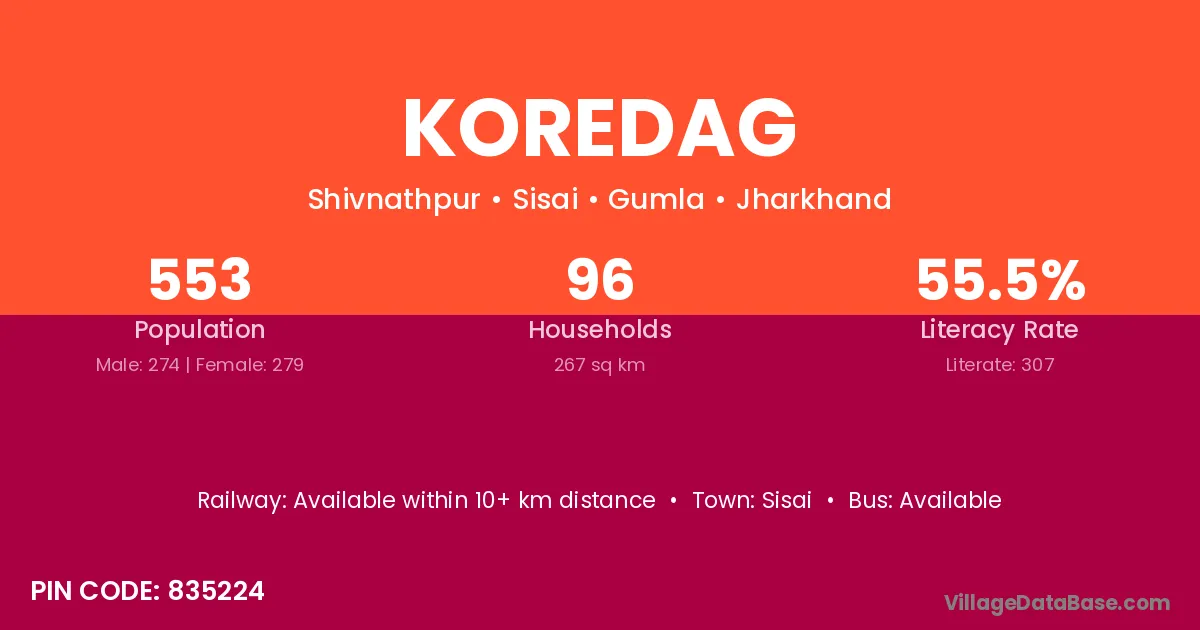 Koredag village has a total population of 553 people, of which 274 are males and 279 are females.