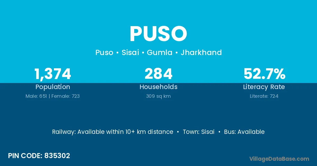 Puso village has a total population of 1,374 people, of which 651 are males and 723 are females.
