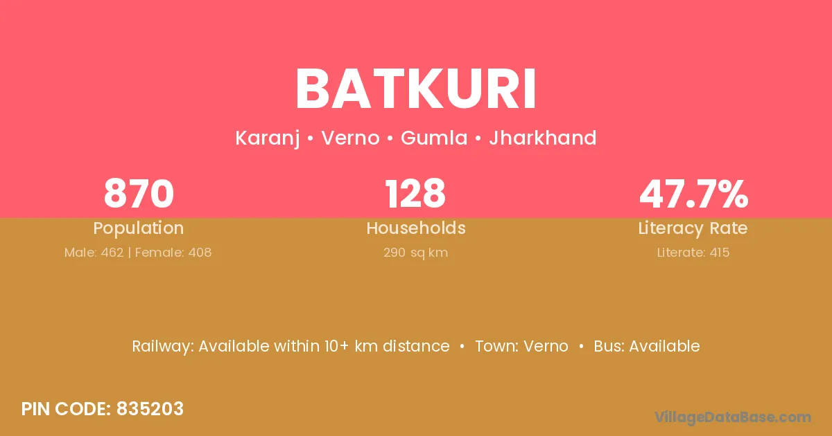 Batkuri village has a total population of 870 people, of which 462 are males and 408 are females.