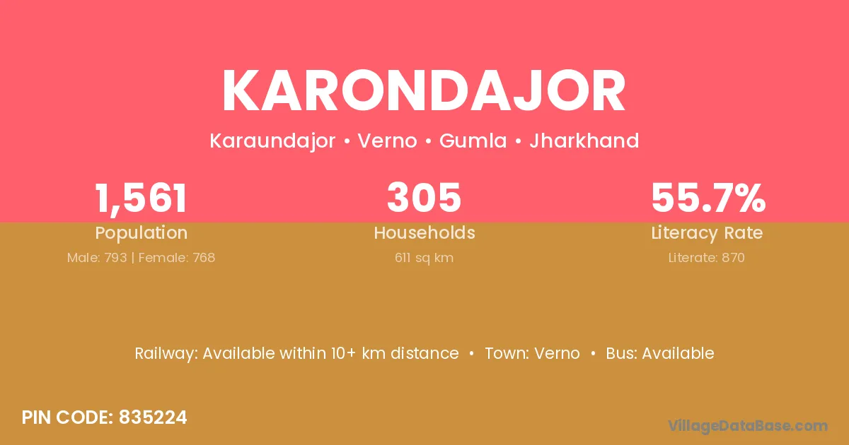 Karondajor village has a total population of 1,561 people, of which 793 are males and 768 are females.