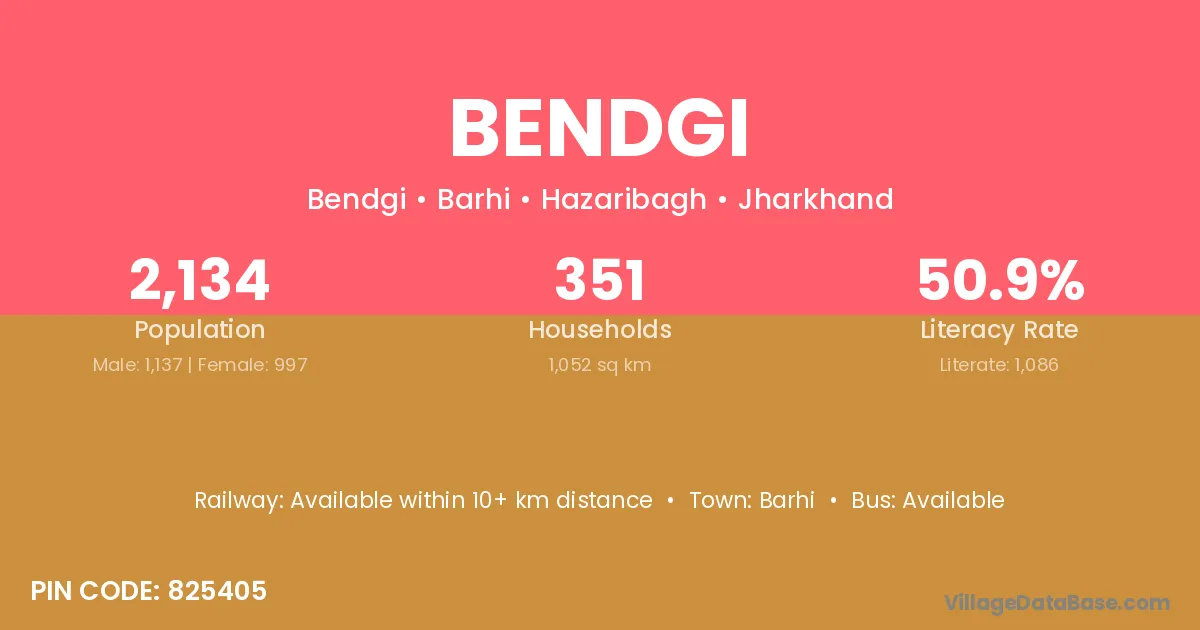 Bendgi village has a total population of 2,134 people, of which 1,137 are males and 997 are females.