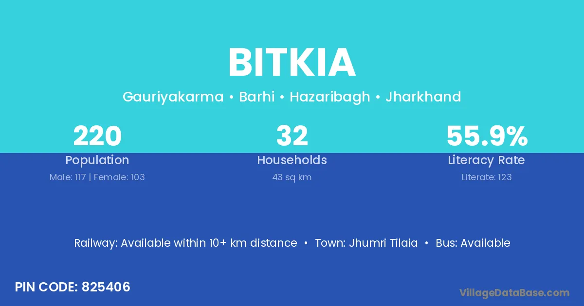 Bitkia village has a total population of 220 people, of which 117 are males and 103 are females.