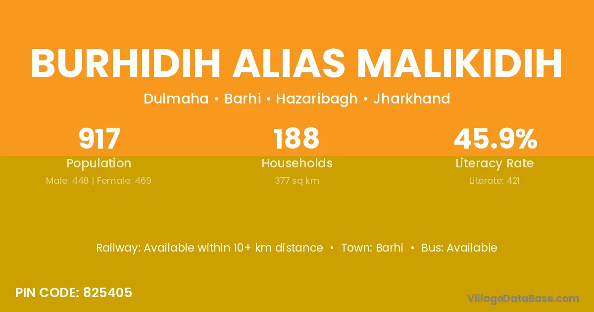 Burhidih Alias Malikidih village has a total population of 917 people, of which 448 are males and 469 are females.