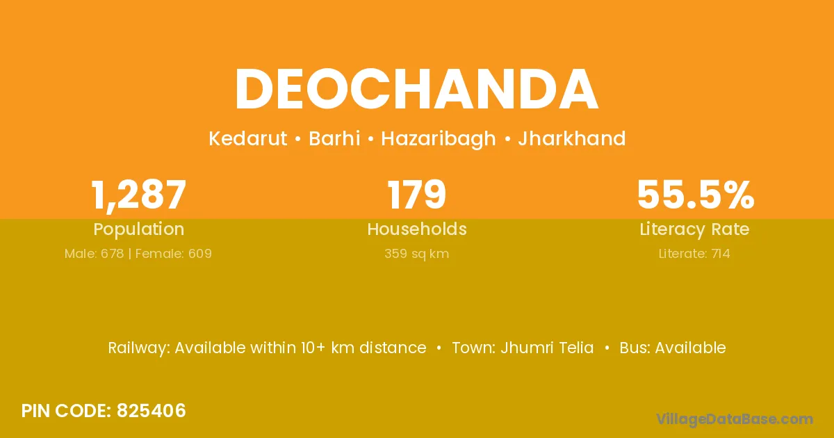 Deochanda village has a total population of 1,287 people, of which 678 are males and 609 are females.