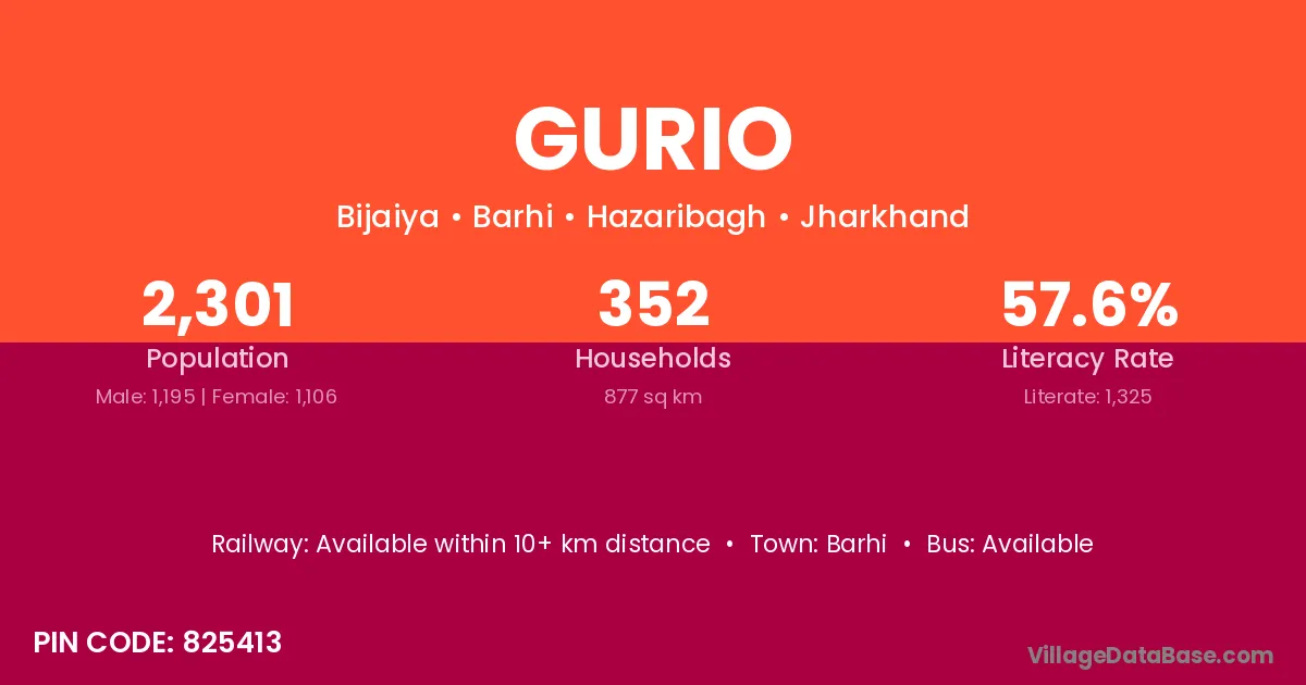 Gurio village has a total population of 2,301 people, of which 1,195 are males and 1,106 are females.