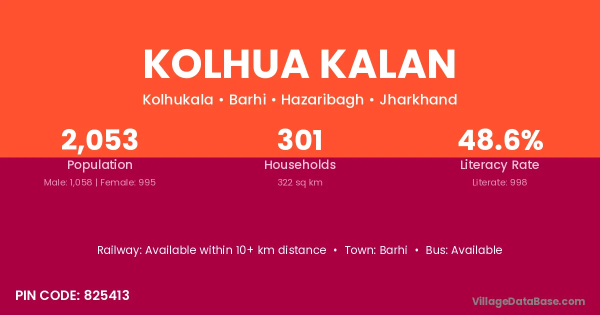 Kolhua Kalan village has a total population of 2,053 people, of which 1,058 are males and 995 are females.