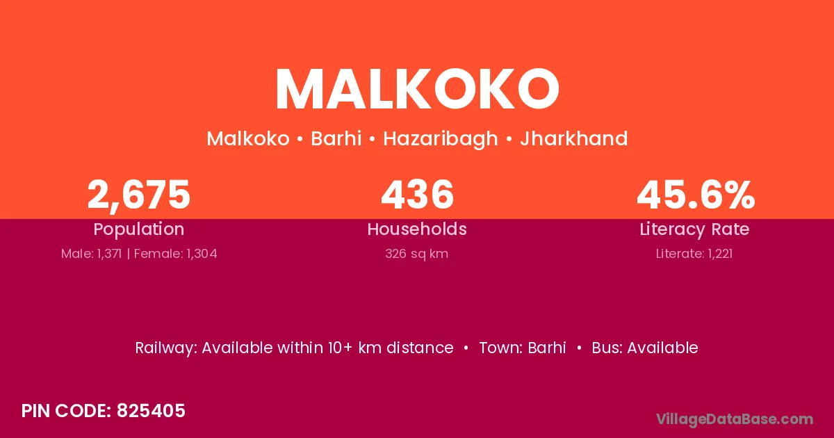 The literacy rate of Malkoko village is 45.64%. Male literacy stands at 55.87% and female literacy at 34.89%.
