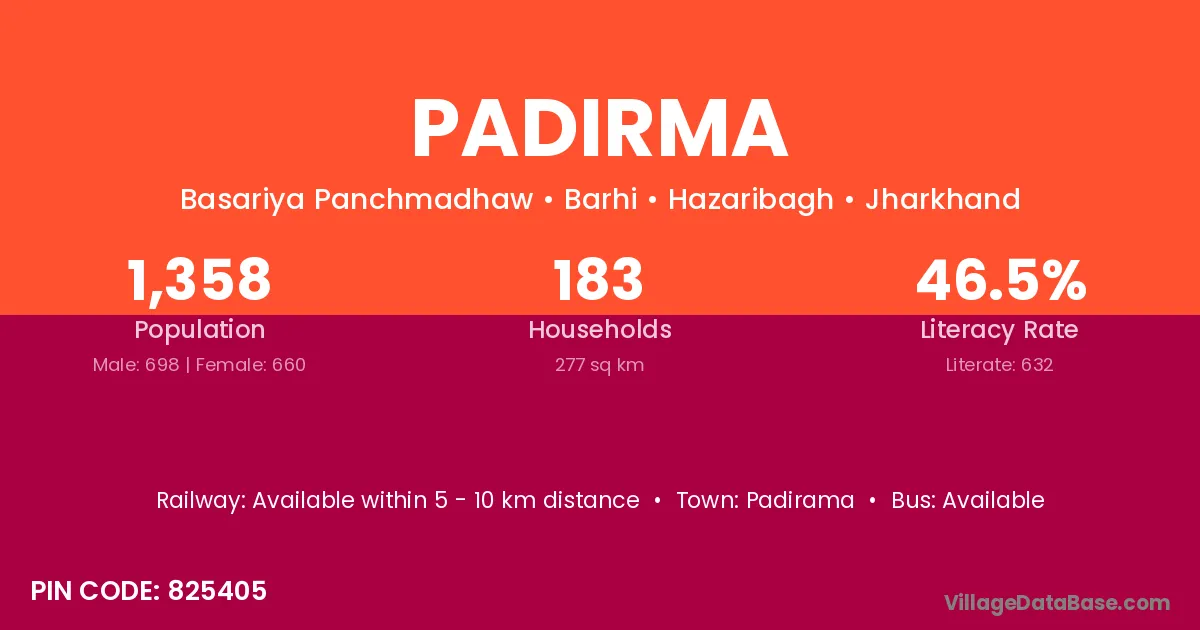 Padirma village has a total population of 1,358 people, of which 698 are males and 660 are females.