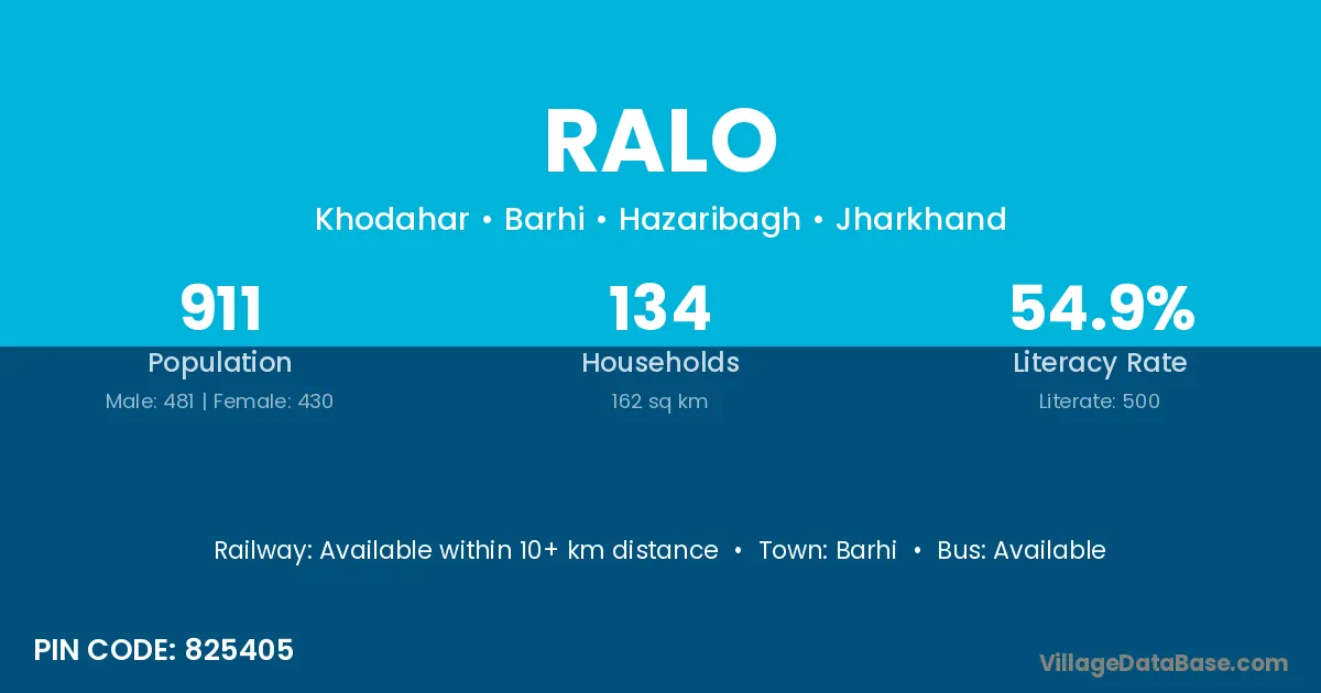 Ralo village has a total population of 911 people, of which 481 are males and 430 are females.