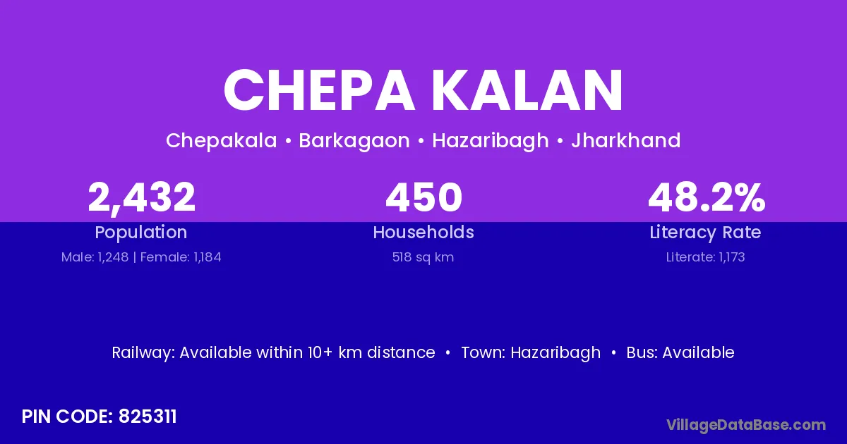 Chepa Kalan village has a total population of 2,432 people, of which 1,248 are males and 1,184 are females.