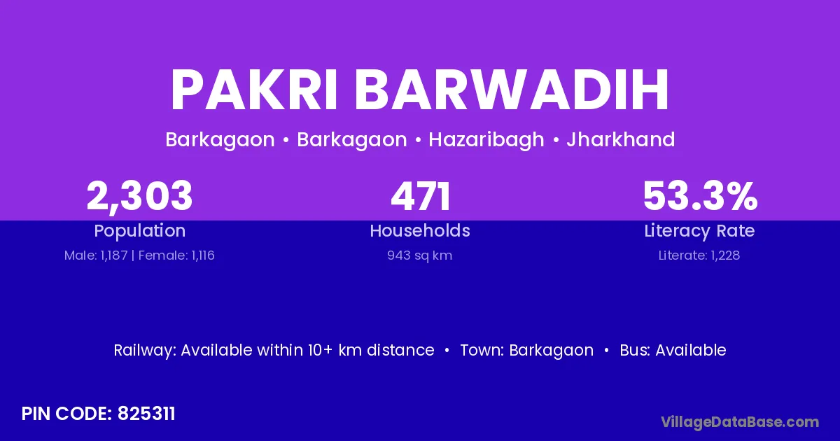Pakri Barwadih village has a total population of 2,303 people, of which 1,187 are males and 1,116 are females.
