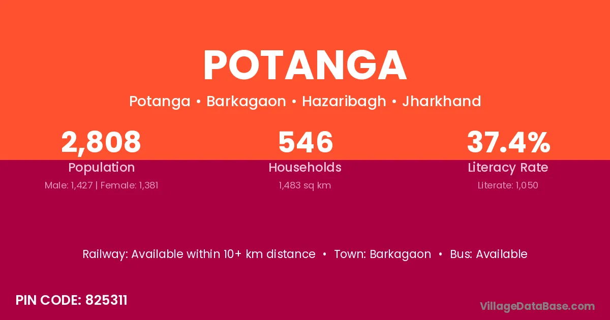 The literacy rate of Potanga village is 37.39%. Male literacy stands at 44.43% and female literacy at 30.12%.