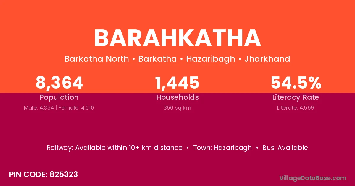 Barahkatha village has a total population of 8,364 people, of which 4,354 are males and 4,010 are females.