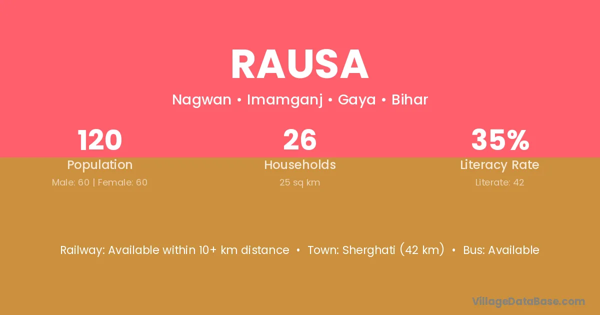 The literacy rate of Rausa village is 41.13%. Male literacy stands at 53.97% and female literacy at 27.87%.