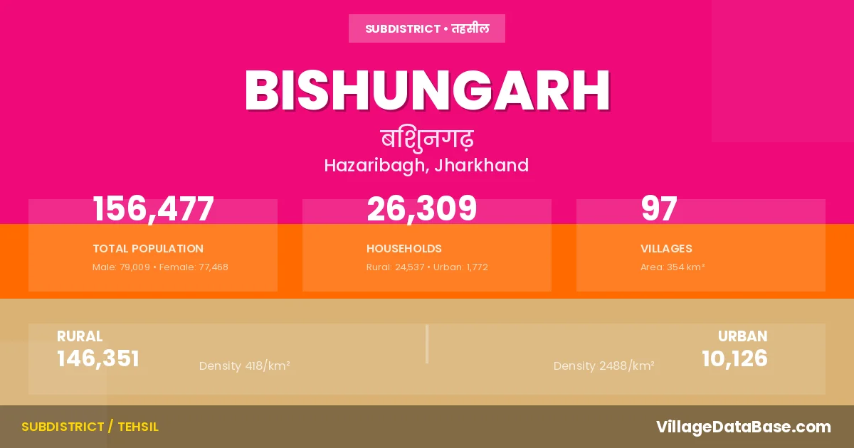 According to the 2011 census The total area of Bishungarh Subdivision is 354 km², with a population of 156477 people. The population density is 441 inhabitants per square kilometre, and there are approximately 26309 houses in the sub district.