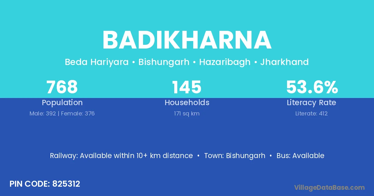 Badikharna village has a total population of 768 people, of which 392 are males and 376 are females.